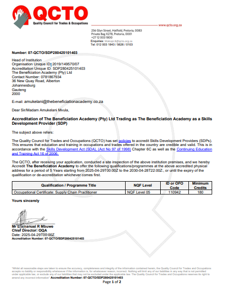 We are proud to announce a significant milestone for The Beneficiation Academy (Pty) Ltd—our institution has officially been accredited as a Skills